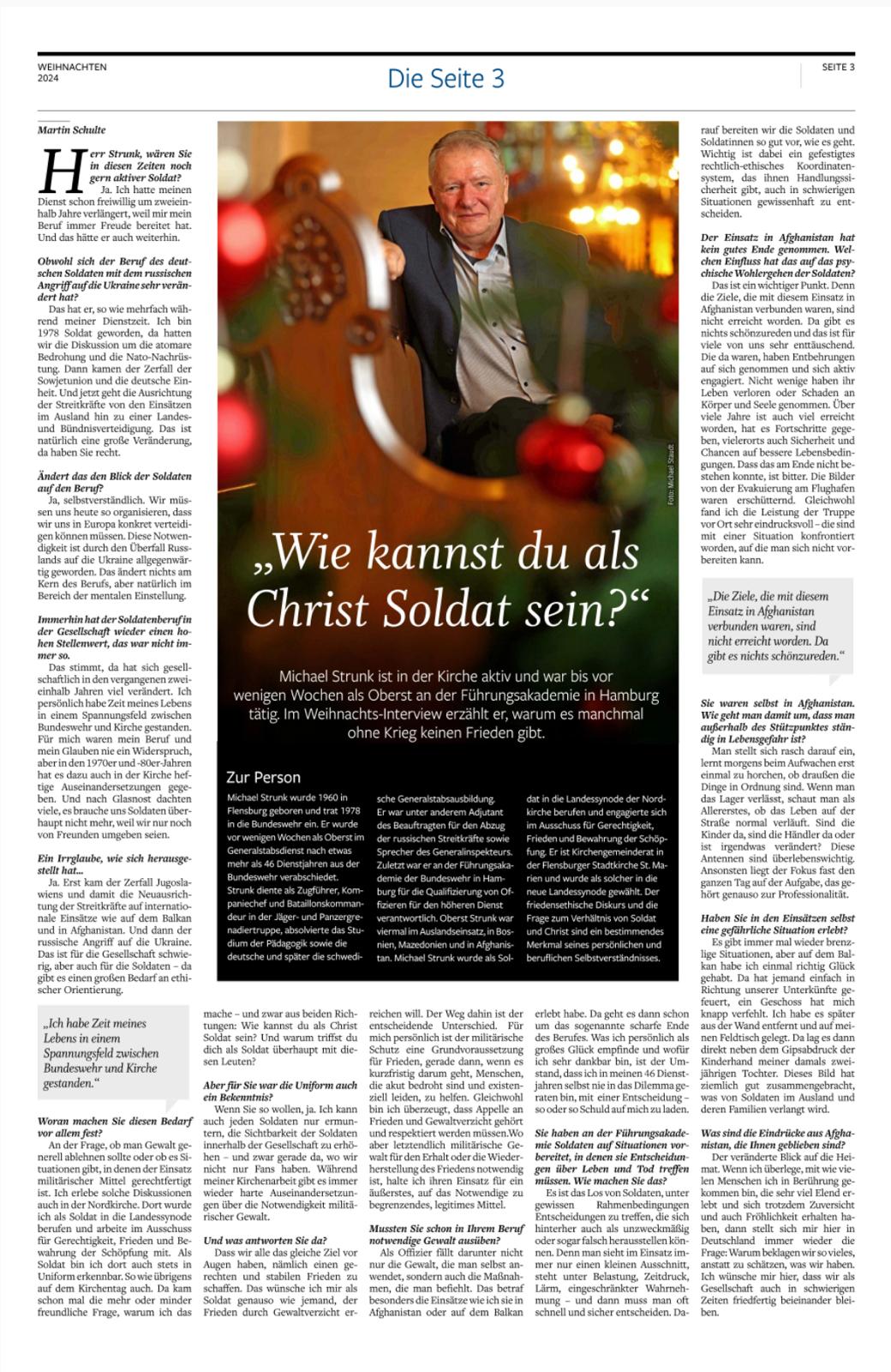 Michael Strunk ist vor kurzem als Oberst i.G. aus der Bundeswehr ausgeschieden. Er ist Alumnus und regelmäßiger Gast beim Hamburger Kreis HOW. Er ist in der Kirche aktiv und erzählt Im Weihnachts-Interview, warum es manchmal ohne Krieg keinen Frieden gibt. Lest hier den verlinkten Artikel oder schaut ihn euch auf dem Schnappschuss an.